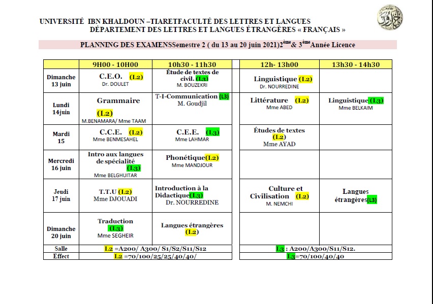 جدول امتحانات السداسي 2 (L2+L3) لجميع قسم اللغة الفرنسية تصفّح المقالات تكريم أ. د.عبد الحميد بورايو جدول امتحانات السداسي 2 (السنة 2 ل + السنة 3 ل) قسم اللغة الانجليزية