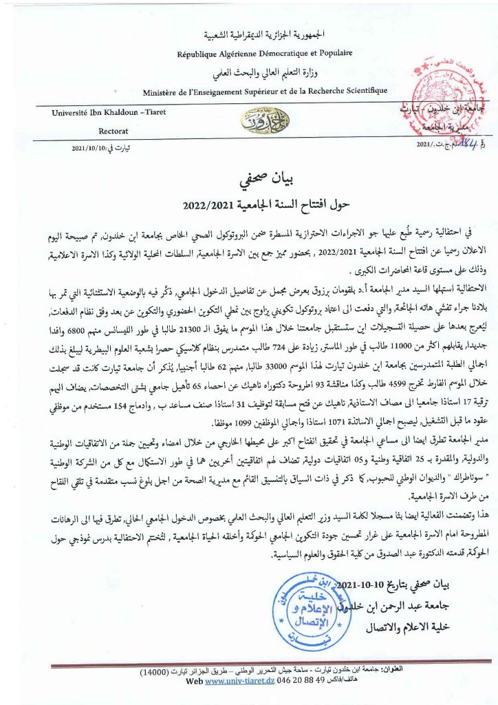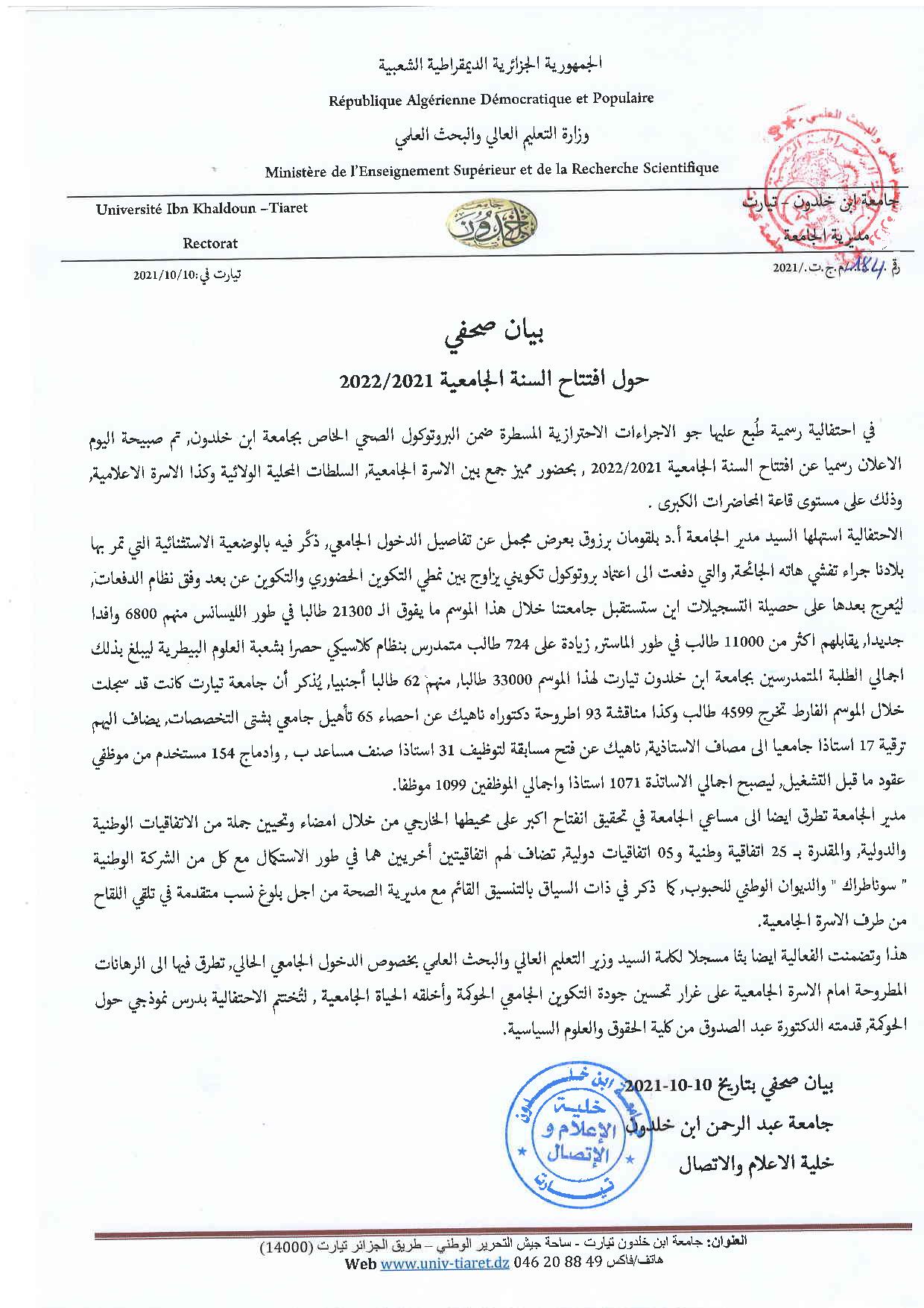 افتتاح السنة الجامعية 2021 / 2022 – بيان