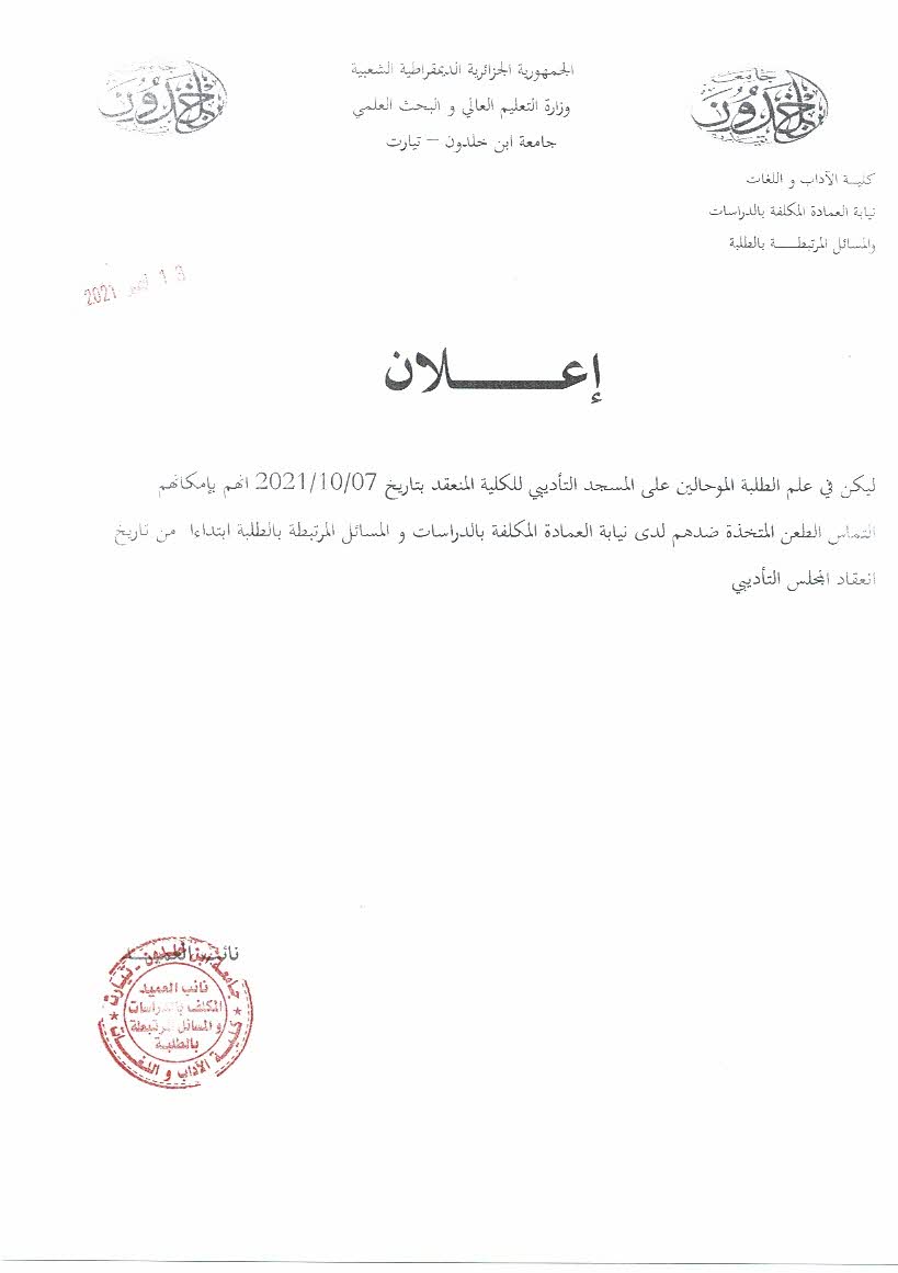 إعلان خاص بالطلبة المحالون إلى المجلس التأديبي للكلية تصفّح المقالات إعلان خاص بالطلبة المقبولين في ماستر 20 بالمائة جميع التخصصات إعلان عن فتح الترشح لانتخاب أعضاء ممثلي الأساتذة والموظفين في اللجان المتساوية الأعضاء
