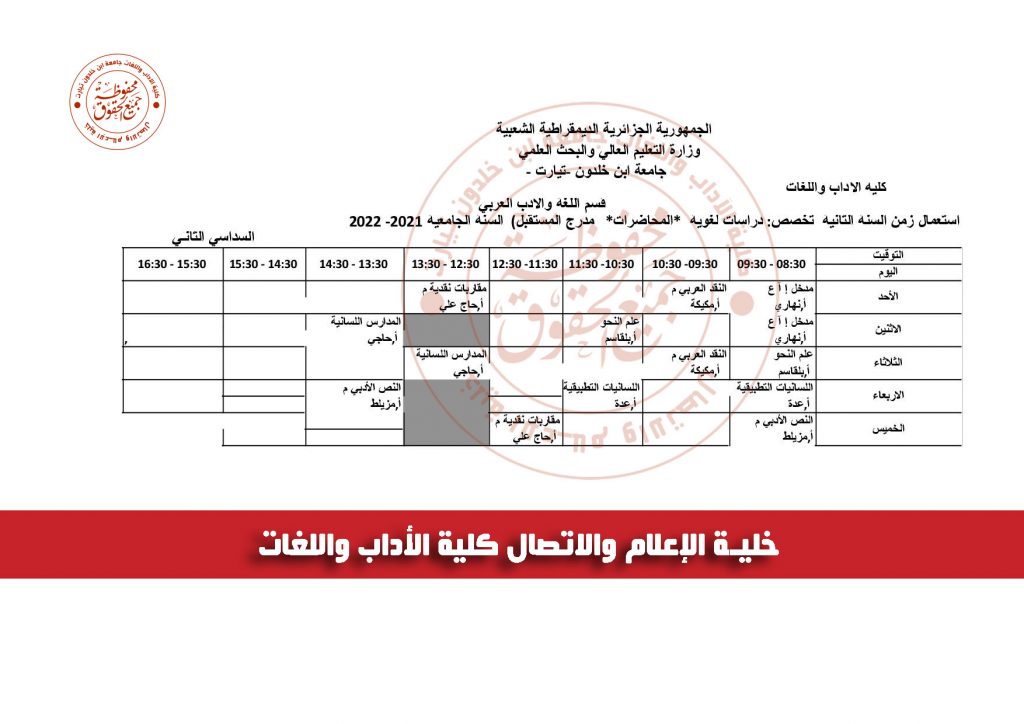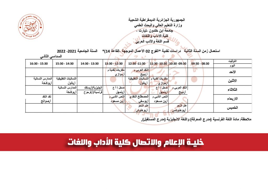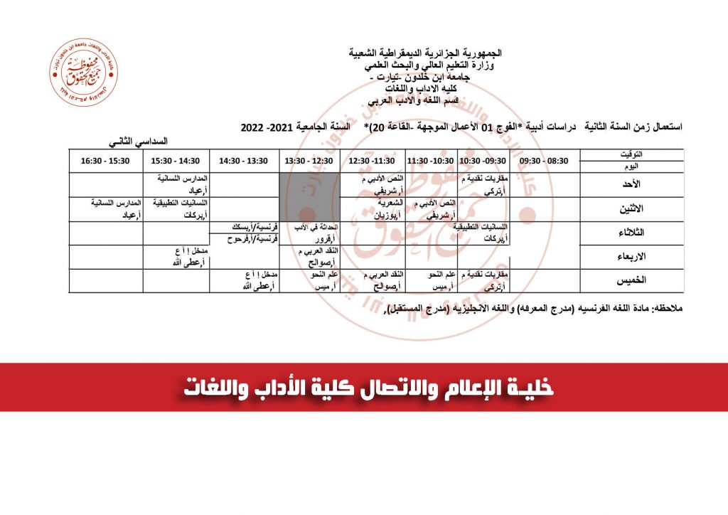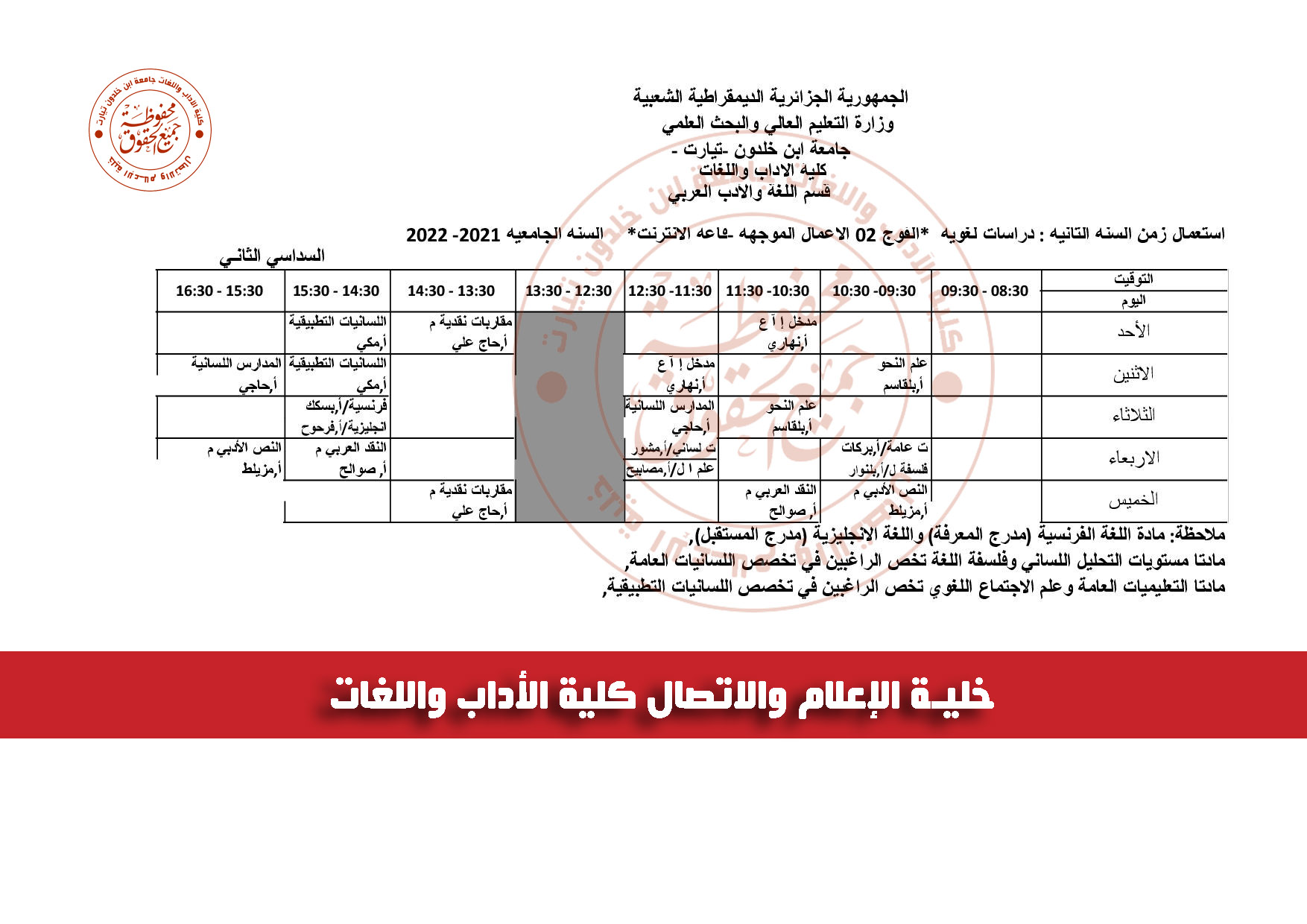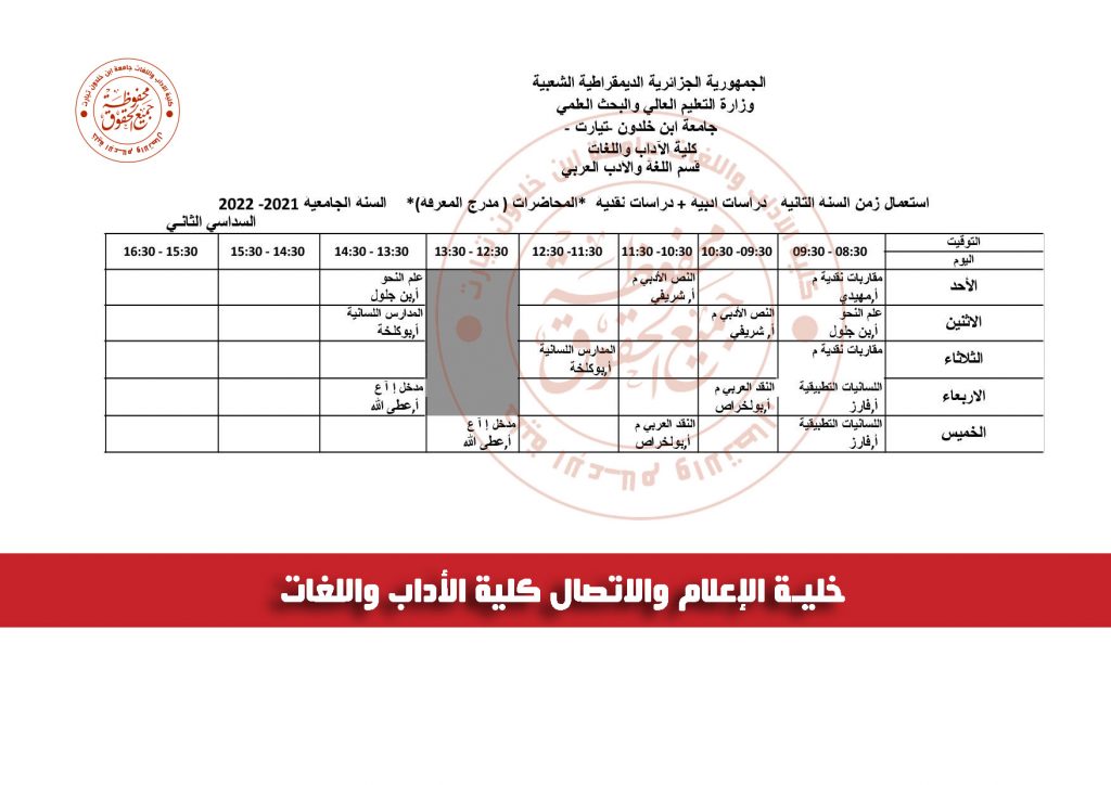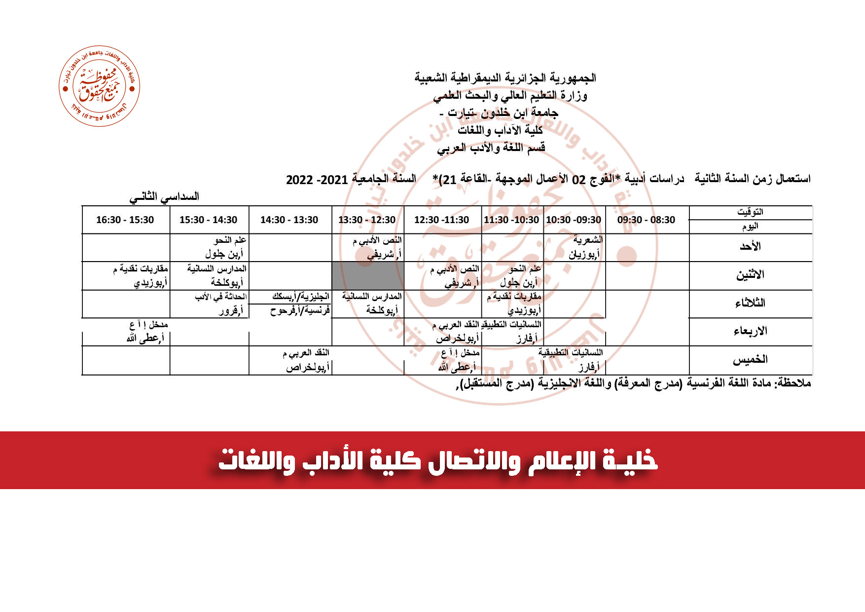 استعمال الزمن الخاص بالسداسي4 للسنة الجامعية 2022/2021 (س2 ليسانس) جميع التخصصات قسم اللغة والأدب العربي