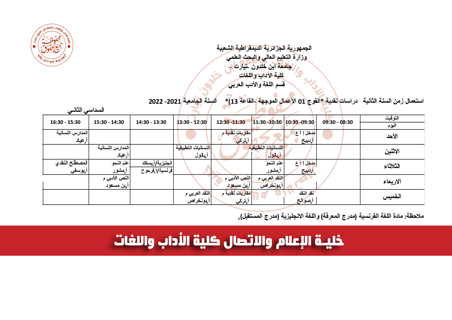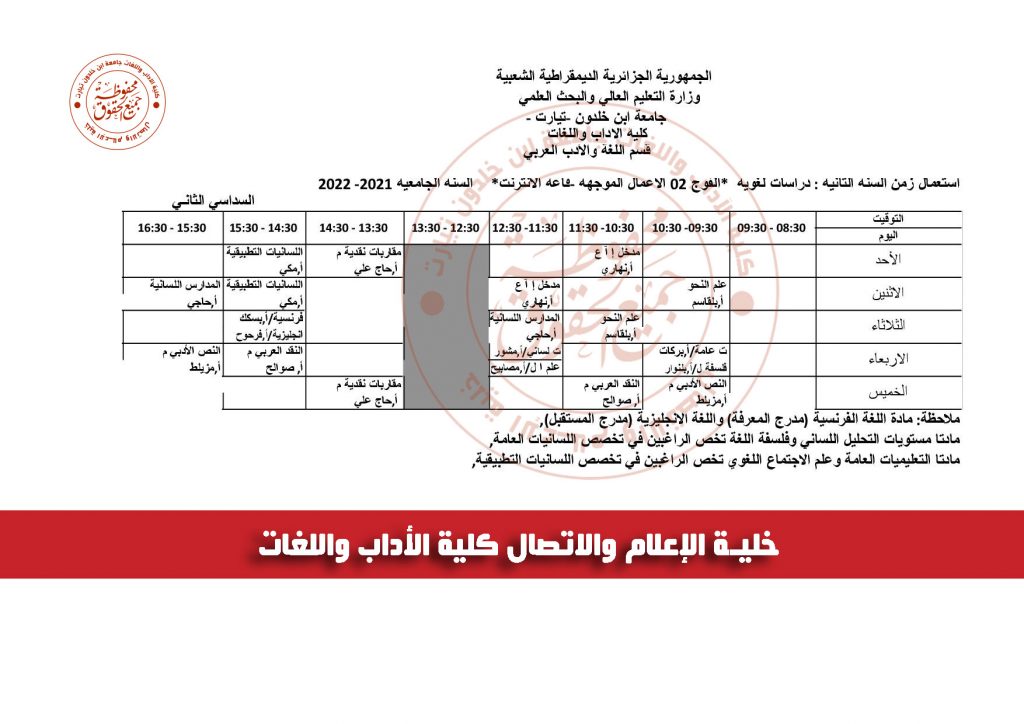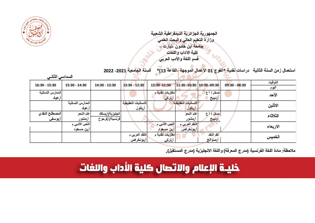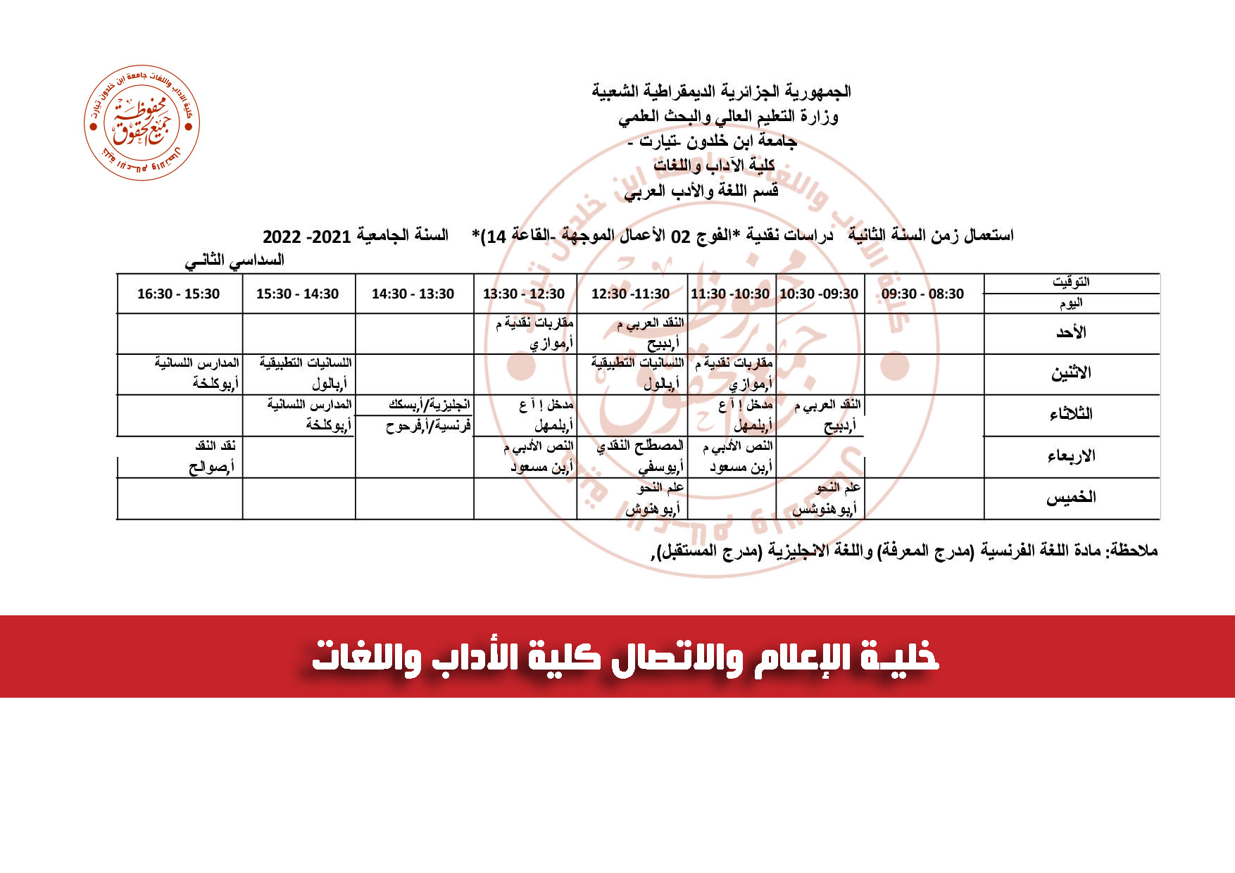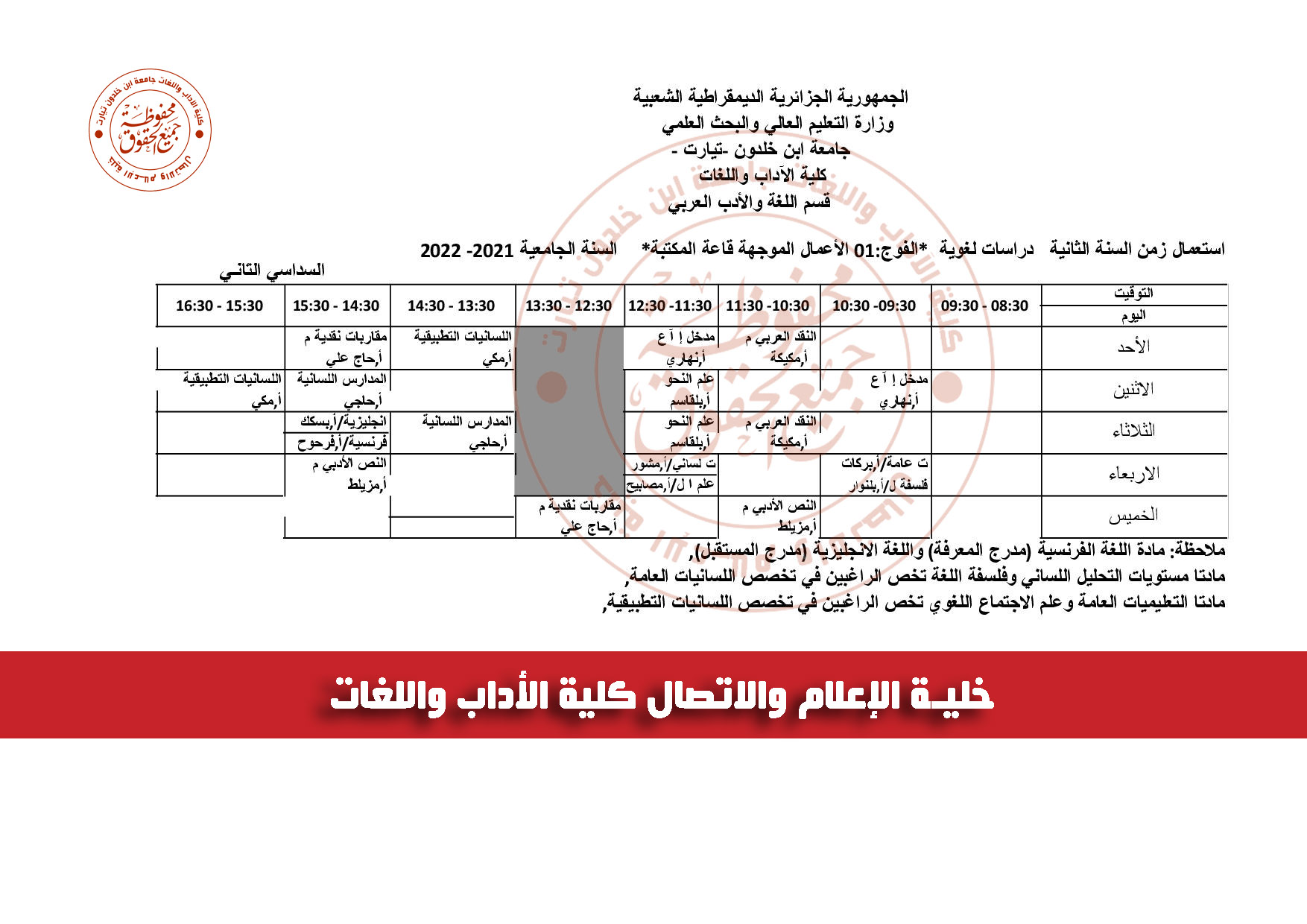 استعمال الزمن الخاص بالسداسي4 للسنة الجامعية 2022/2021 (س2 ليسانس) جميع التخصصات قسم اللغة والأدب العربي