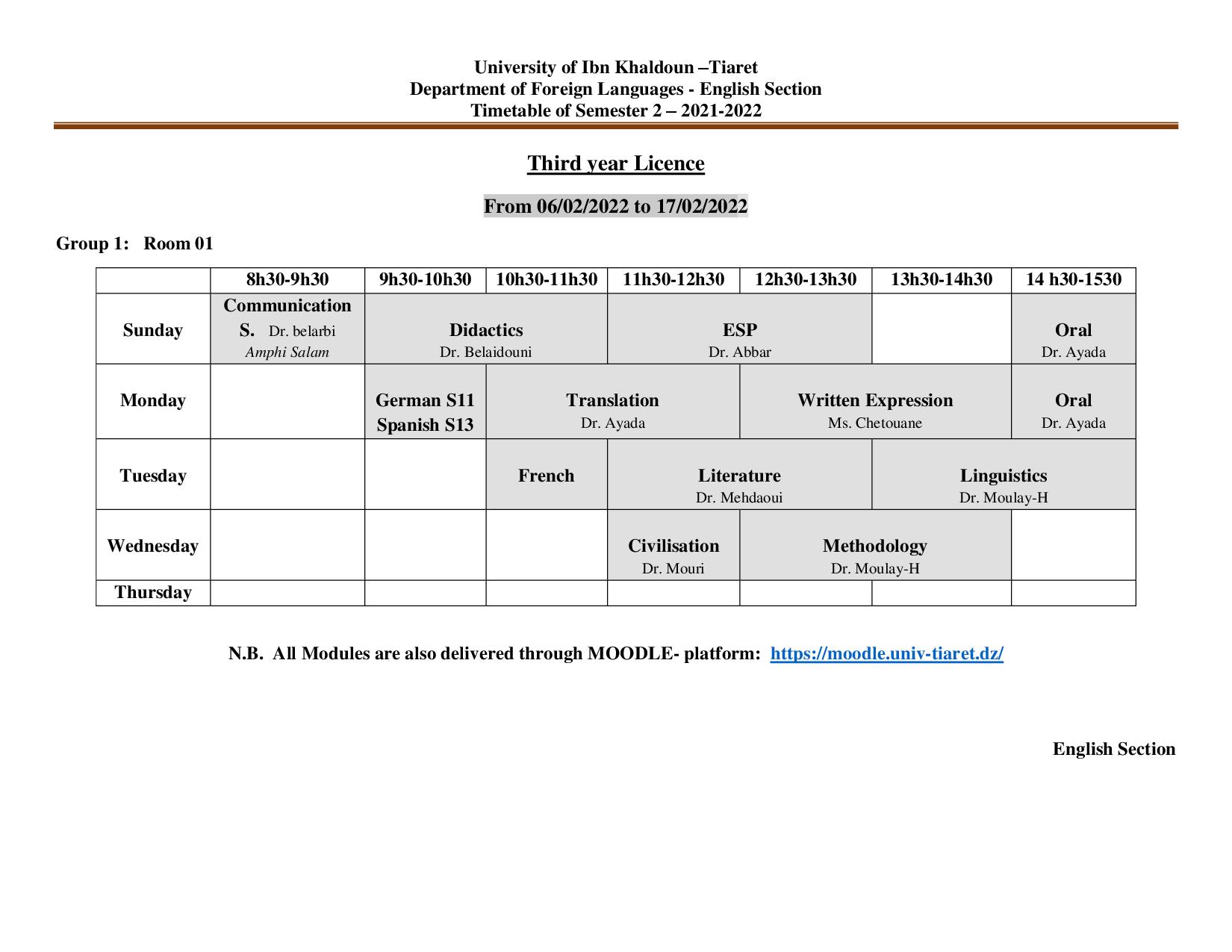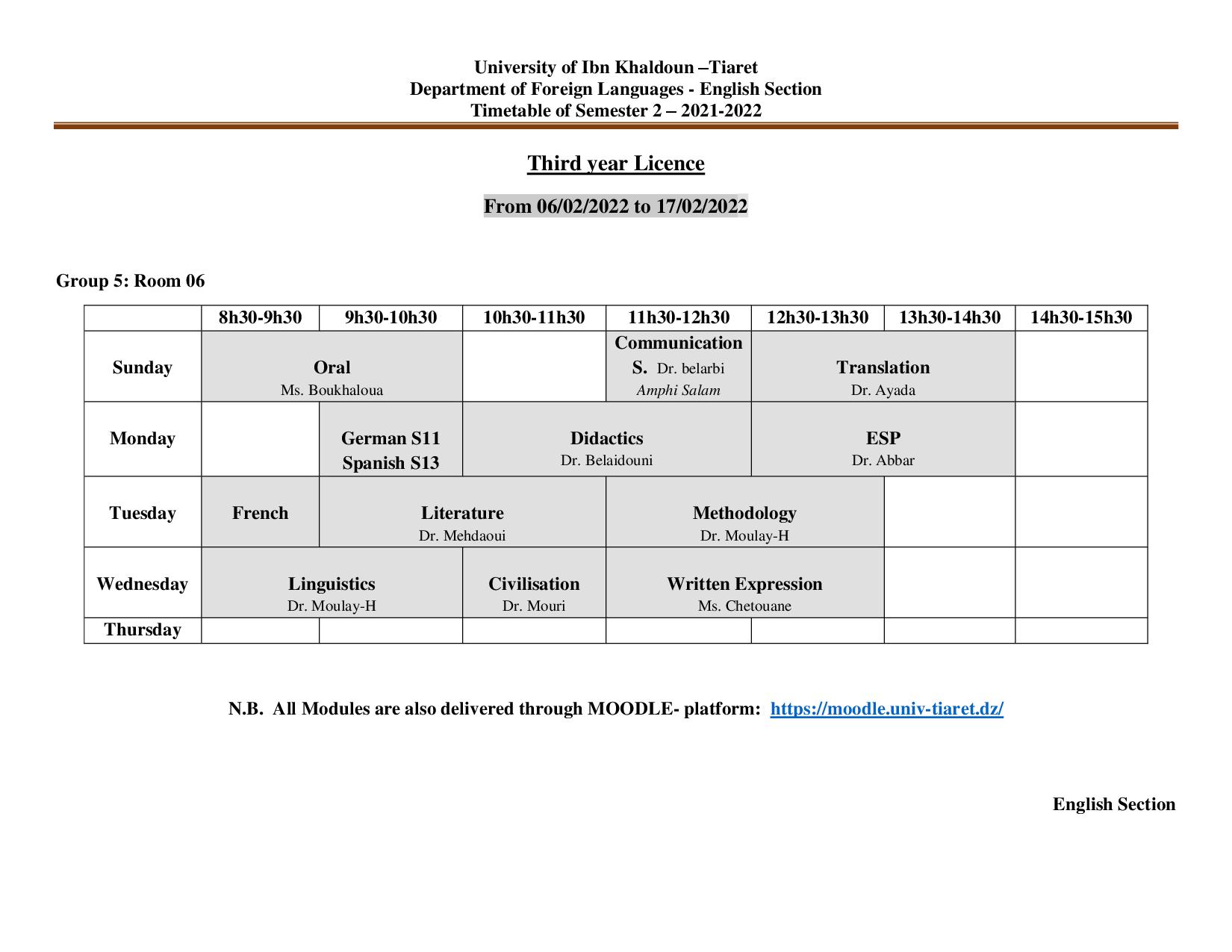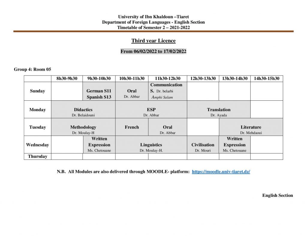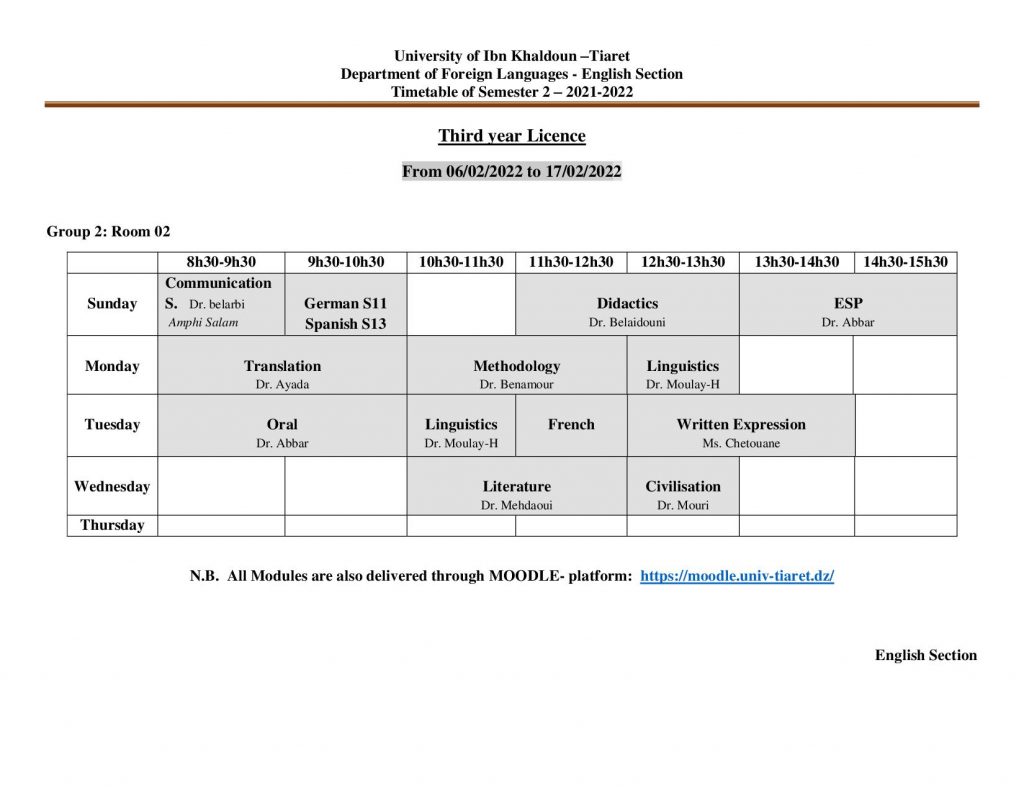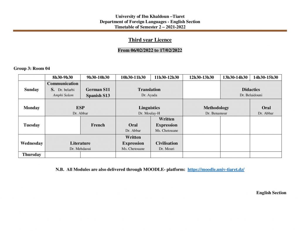 جدول إستعمال الزمن لطلبة السنة 03 ليسانس فرع اللغة الإنجليزية 2022/2021 تصفّح المقالات جدول إستعمال الزمن لطلبة السنة الثانية ليسانس فرع اللغة الإنجليزية 2022/2021 جداول استعمال الزمن السنة الثانية والثالثة ليسانس السداسي 04 و 06 فرع اللغة الفرنسية