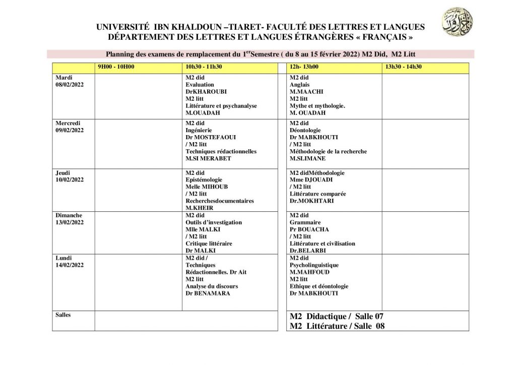 جدول الإمتحانات التعويضية للسداسي الأول 2022/2021 فرع اللغة الفرنسية لطلبة السنة الثانية ماستر جميع التخصصات تصفّح المقالات تعزية وفاة والدة أستاذنا الفاضل أ.د عابد بوهادي أستاذ بقسم اللغة والأدب العربي جدول الإمتحانات التعويضية لطلبة السنة الأولى ماستر فرع اللغة الفرنسية
