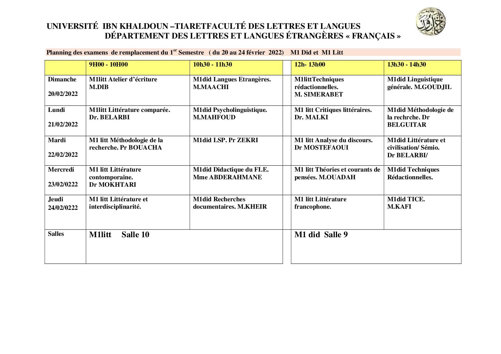 جدول الإمتحانات التعويضية للسداسي الأول 2022/2021 فرع اللغة الفرنسية لطلبة السنة الأولى ماستر جميع التخصصات