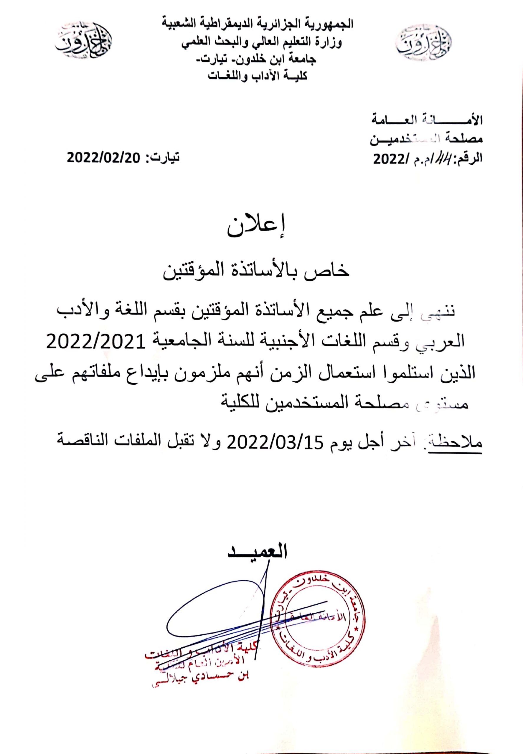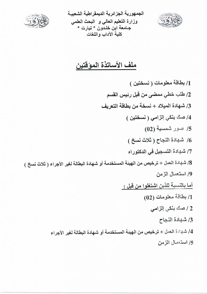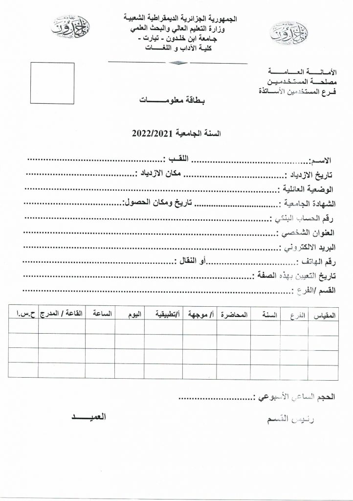 إعلان خاص بالأساتذة المؤقتين بكلية الآداب واللغات لتحميل بطاقة المعلومات إضغط هنا 1- الإعلان : 2- الملف الإداري : لتحميل بطاقة المعلومات إضغط هنا لتحميل بطاقة المعلومات إضغط هنا تصفّح المقالات المناقشة العلنية لأطروحة دكتوراه الطور الثالث الموسومة بالتفكير النقدي المغاربي من الوجه البلاغي إلى البيان الفلسفي. جدول الامتحانات التعويضية والديون (م1 + م2 + س1 ل) لقسم اللغة والأدب العربي 2022/2021