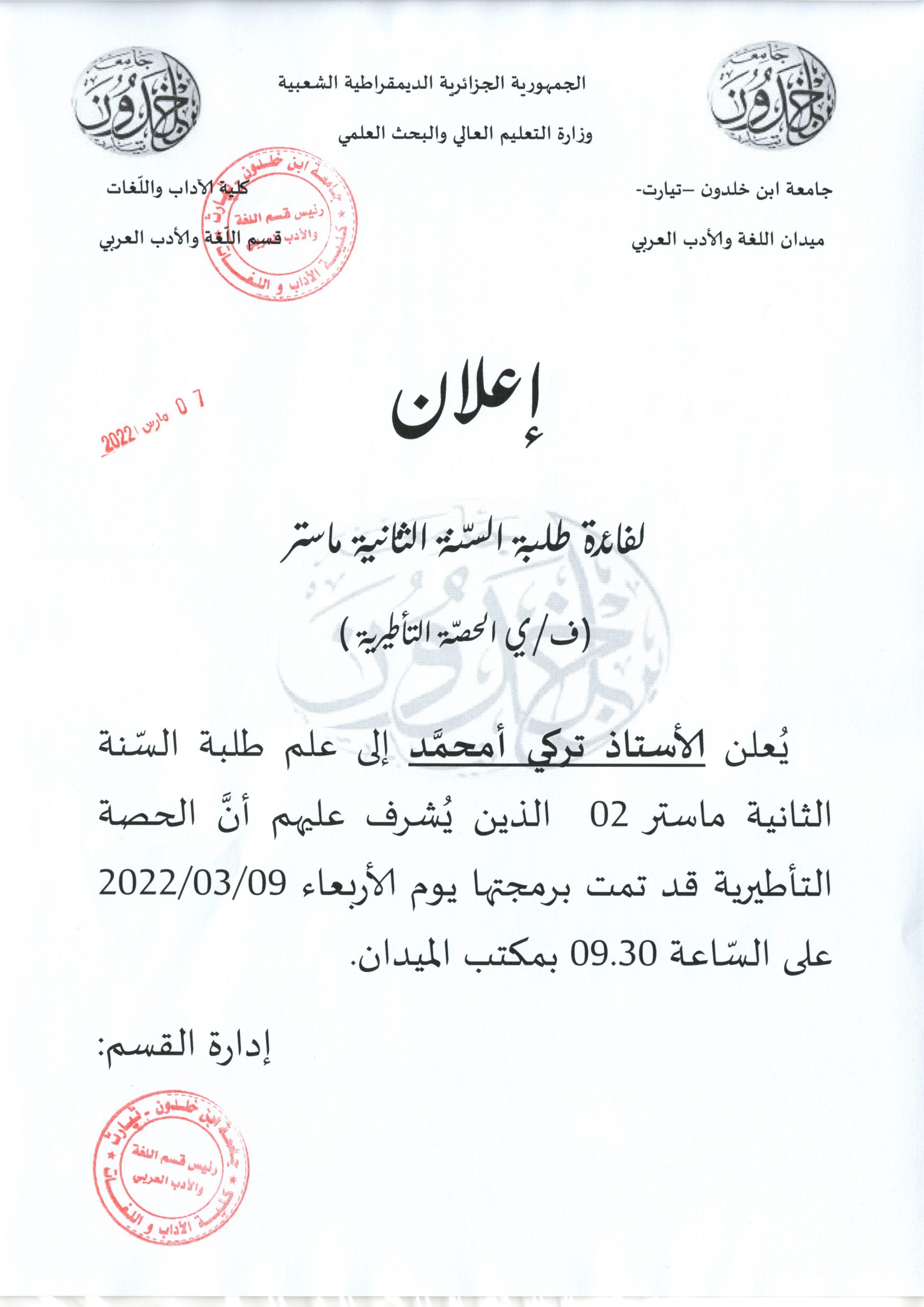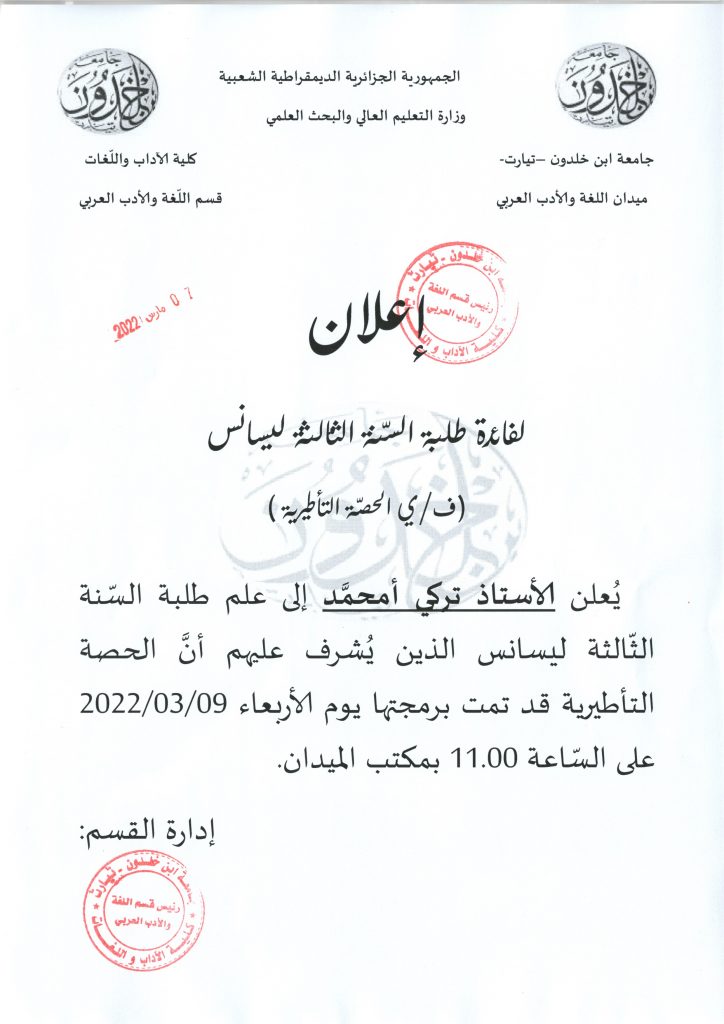 إعلان ميدان اللغة والأدب العربي خاص بطلبة السنة الثالثة ليسانس والثانية ماستر إعلان ميدان اللغة والأدب العربي خاص بطلبة السنة الثالثة ليسانس إعلان ميدان اللغة والأدب العربي خاص بطلبة السنة الثانية ماستر تصفّح المقالات الإجابة النموذجية وسلم التنقيط لامتحان مقياس مقدمة في الترجمة (د.فصلة علال بلال) 02 ليسانس فرع اللغة الإنجليزية علامات الامتحان السداسي الأول ، السنة أولى ماستير ، مقياس بيداغوجيا ( محاضرة + أعمال موجهة الفوج الثاني) د.طيب بن جامعة