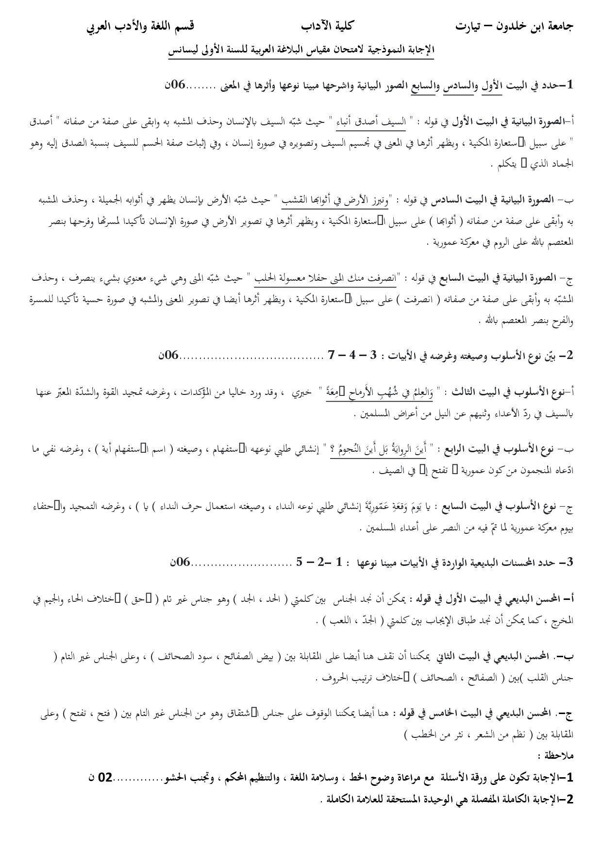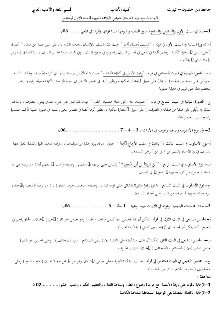 التصحيح النموذجي ونقاط مقياس البلاغة العربية 01 ليسانس (د.عدة قادة)