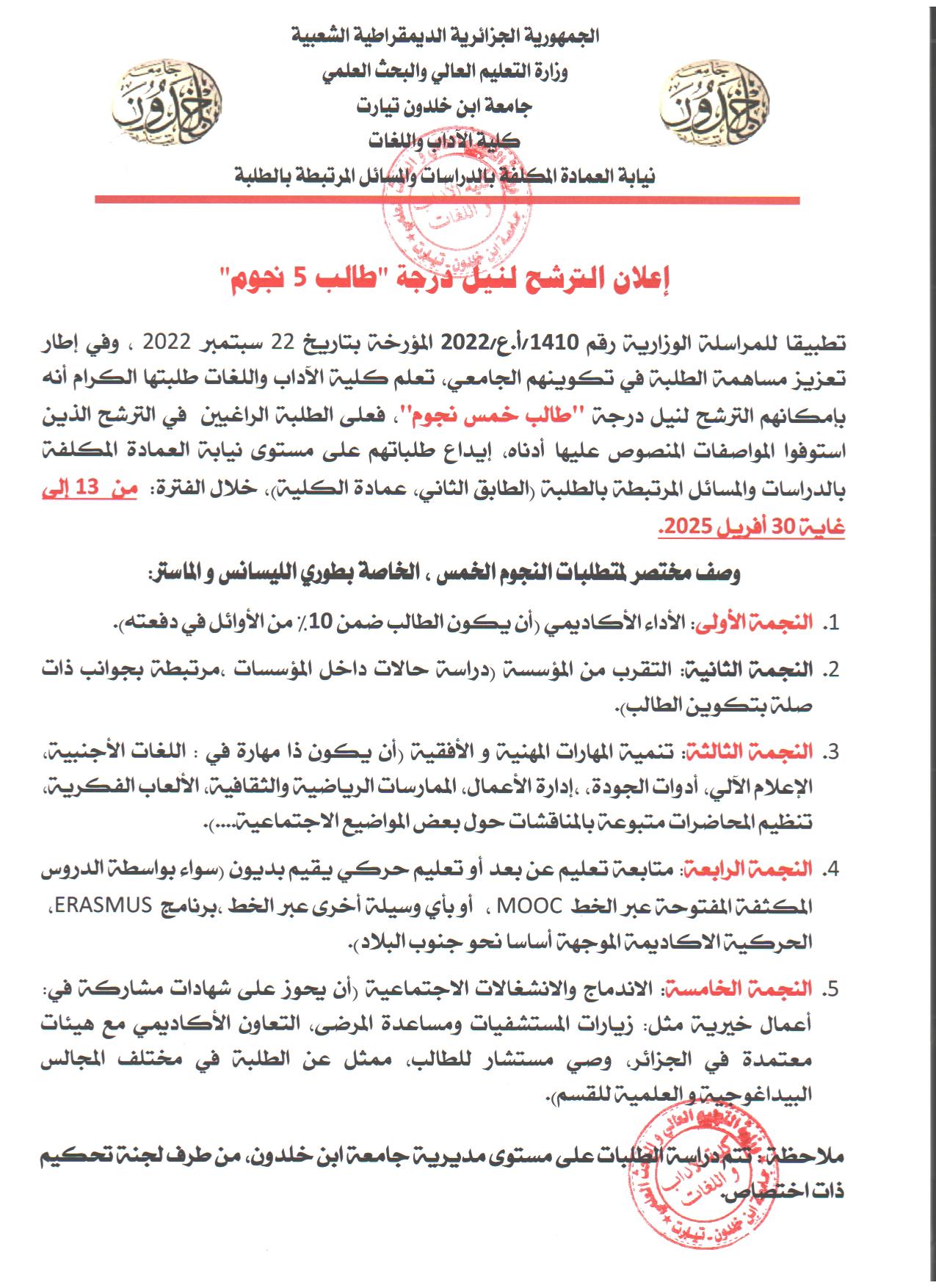 تطبيقا للمراسلة الوزارية رقم 1410/أ.ع/2022 المؤرخة بتاريخ 22 سبتمبر 2022 ، وفي إطار تعزيز مساهمة الطلبة في تكوينهم الجامعي، تعلم كلية الآداب واللغات طلبتها الكرام أنه بإمكانهم الترشح لنيل درجة ”طالب خمس نجوم”، فعلى الطلبة الراغبين في الترشح الذين استوفوا المواصفات المنصوص عليها أدناه، إيداع طلباتهم على مستوى نيابة العمادة المكلفة بالدراسات والمسائل المرتبطة بالطلبة (الطابق الثاني، عمادة الكلية)، خلال الفترة: من 13 إلى غاية 30 أفريل 2025.