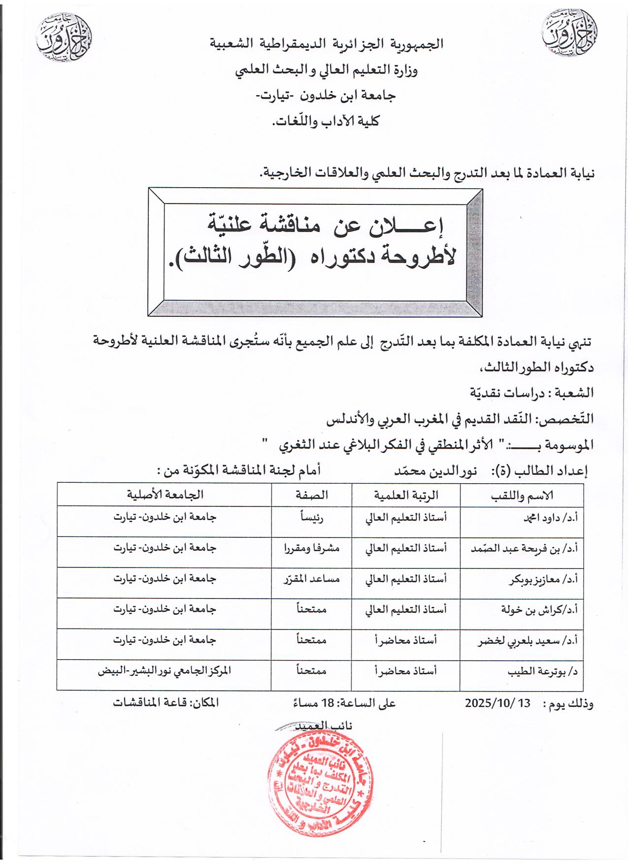 📢 إعلان عن مناقشة علنية لأطروحة دكتوراه (الطور الثالث)