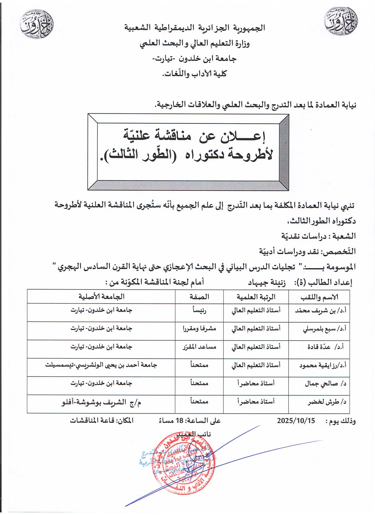 إعلان عن مناقشة علنية لأطروحة دكتوراه (الطور الثالث)
