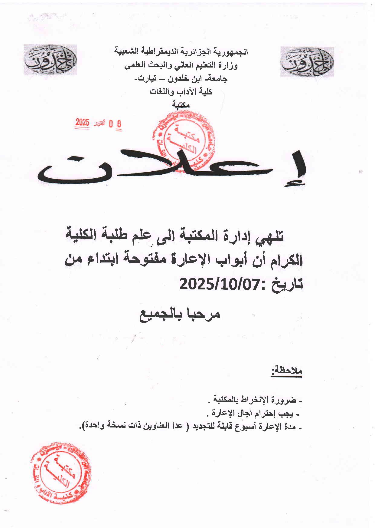 إعلان مكتبة الكلية (الإعارة) تصفّح المقالات إعلان عن مناقشة علنية لأطروحة دكتوراه (الطور الثالث) إعداد الطالبة: زنينة جيهاد 📚 المحاضرة الافتتاحية للسنة الجامعية 2025 – قسم اللغة الفرنسية