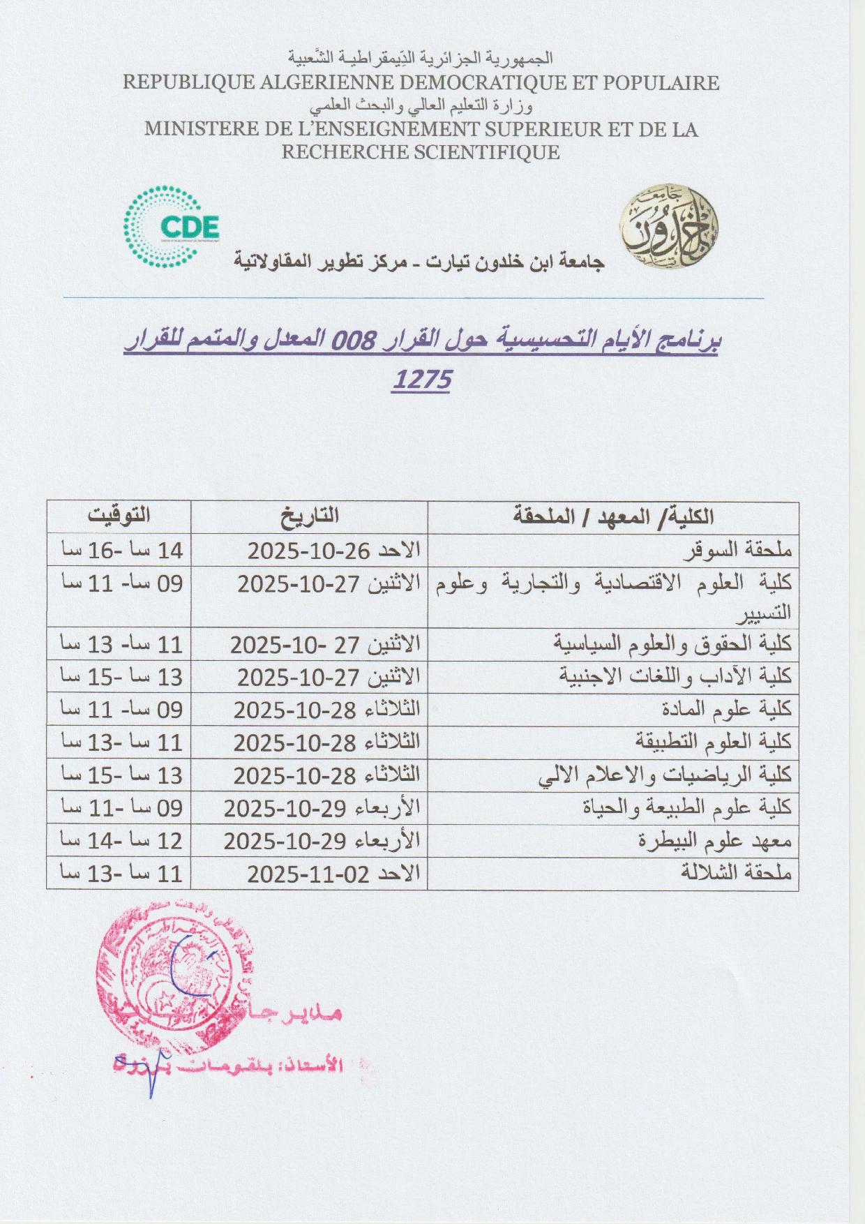 البرنامج الرسمي للأيام التحسيسية حول القرار 008 المعدّل والمتمم للقرار 1275، والمنظم من طرف مركز تطوير المقاولاتية بجامعة ابن خلدون تيارت.