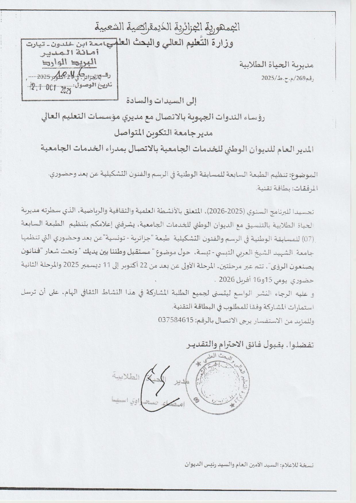 في إطار البرنامج السنوي (2025-2026) المتعلق بالأنشطة العلمية والثقافية والرياضية، وبالتنسيق مع الديوان الوطني للخدمات الجامعية، تعلن مديرية الحياة الطلابية عن تنظيم الطبعة السابعة للمسابقة الوطنية في الرسم والفنون التشكيلية، لفائدة طلبة مؤسسات التعليم العالي.