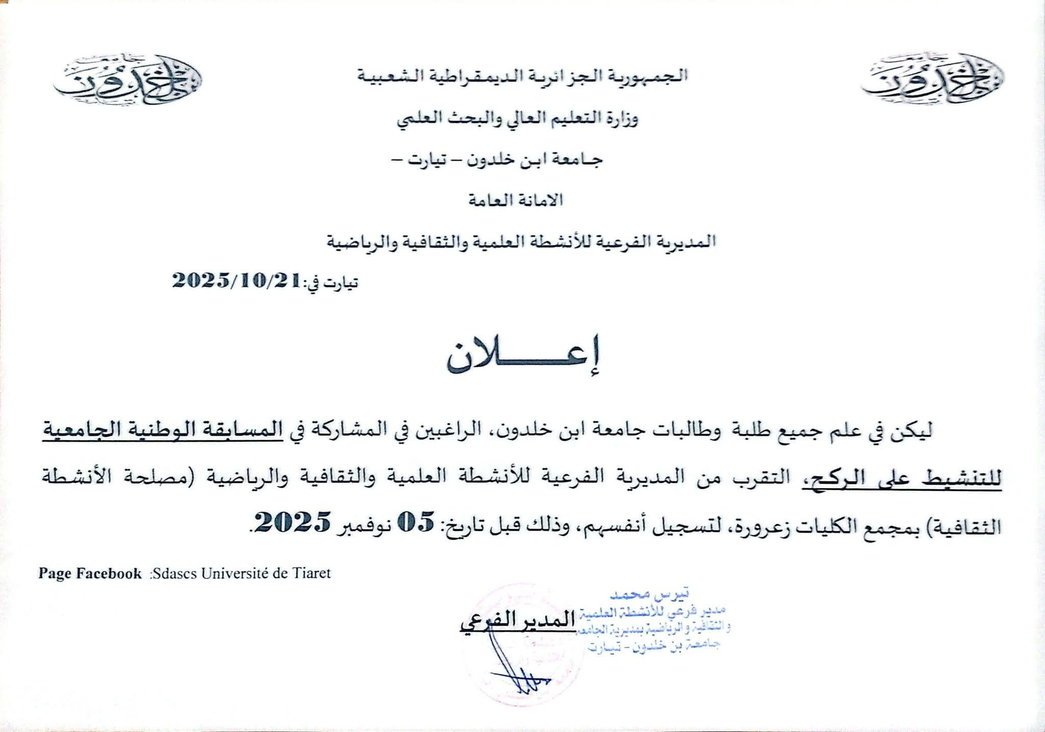 تُعلم الجامعة جميع الطلبة والطالبات الراغبين في المشاركة في المسابقة الوطنية الجامعية للتنشيط على الركح بضرورة التقرب من المديرية الفرعية للأنشطة العلمية والثقافية والرياضية (مصلحة الأنشطة الثقافية) بمجمع الكليات زعزورة، من أجل تسجيل أنفسهم قبل 05 نوفمبر 2025.