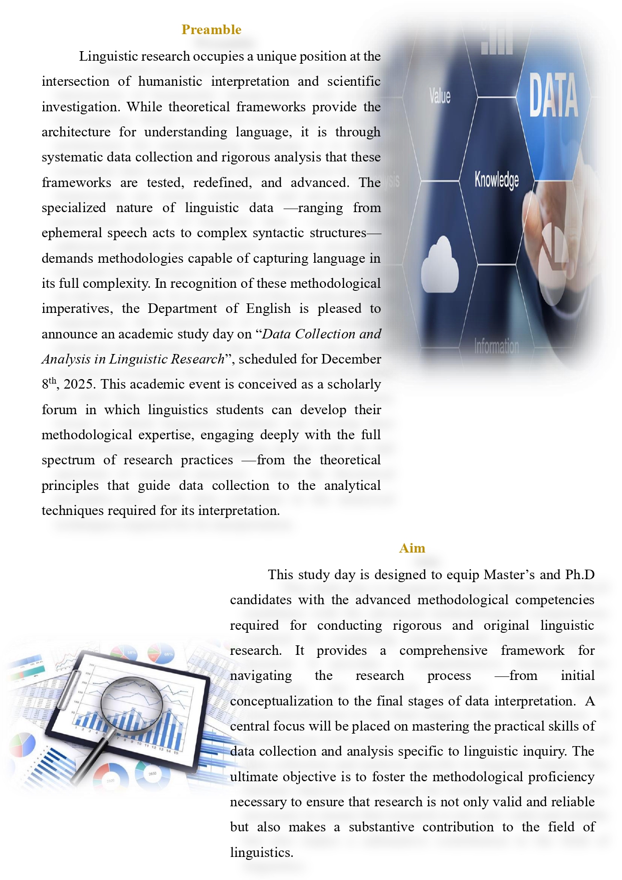 The English Department is pleased to announce an upcoming Study Day on “Data Collection and Analysis in Linguistic Research”, to be held on December 8th, 2025 at ALWIAM Amphitheatre. This event is designed to address the core methodological requirements of linguistic research, focusing on the critical examination of methods for collecting and analysing linguistic data. It is conceived primarily as a forum for Master’s and Ph. D candidates in linguistics to advance their methodological expertise