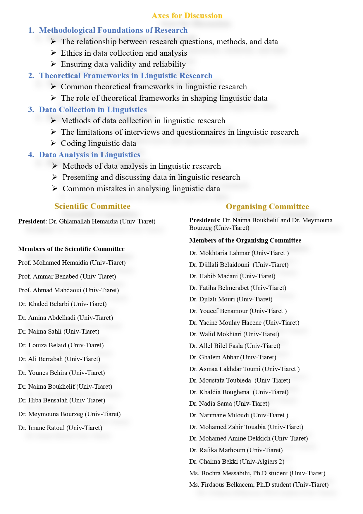 We encourage all Master’s and PhD students to join us for an engaging program featuring thought-provoking, interactive scholarly discussions, and practical workshops on data collection and analysis in linguistic research. This event presents a valuable opportunity to enhance your research skills, exchange ideas with peers and academics, and contribute to advancing your linguistic research. Mark your calendars for December 8th, 2025 and be part of this enriching academic experience at ALWIAM Amphitheater