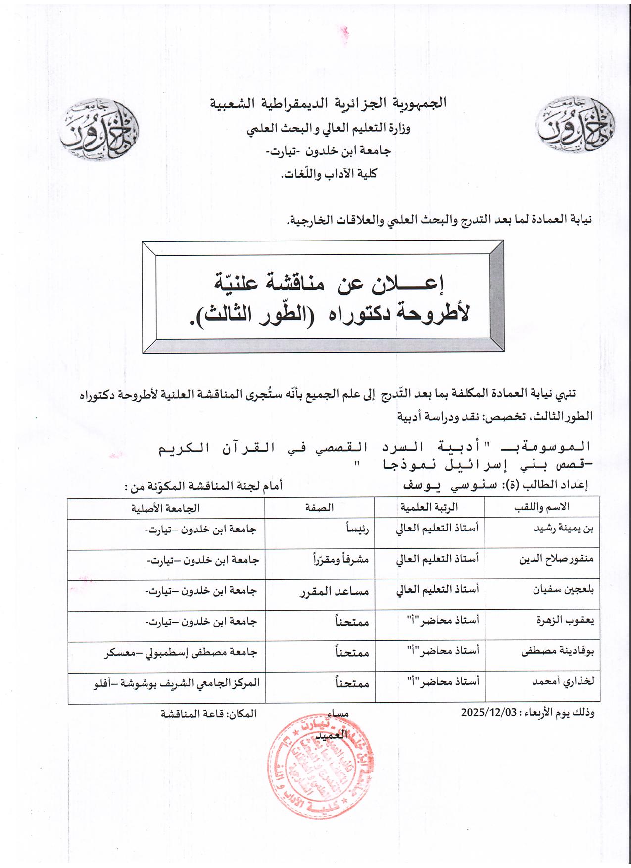 📢 إعلان عن مناقشة علنية لأطروحة دكتوراه (الطور الثالث)