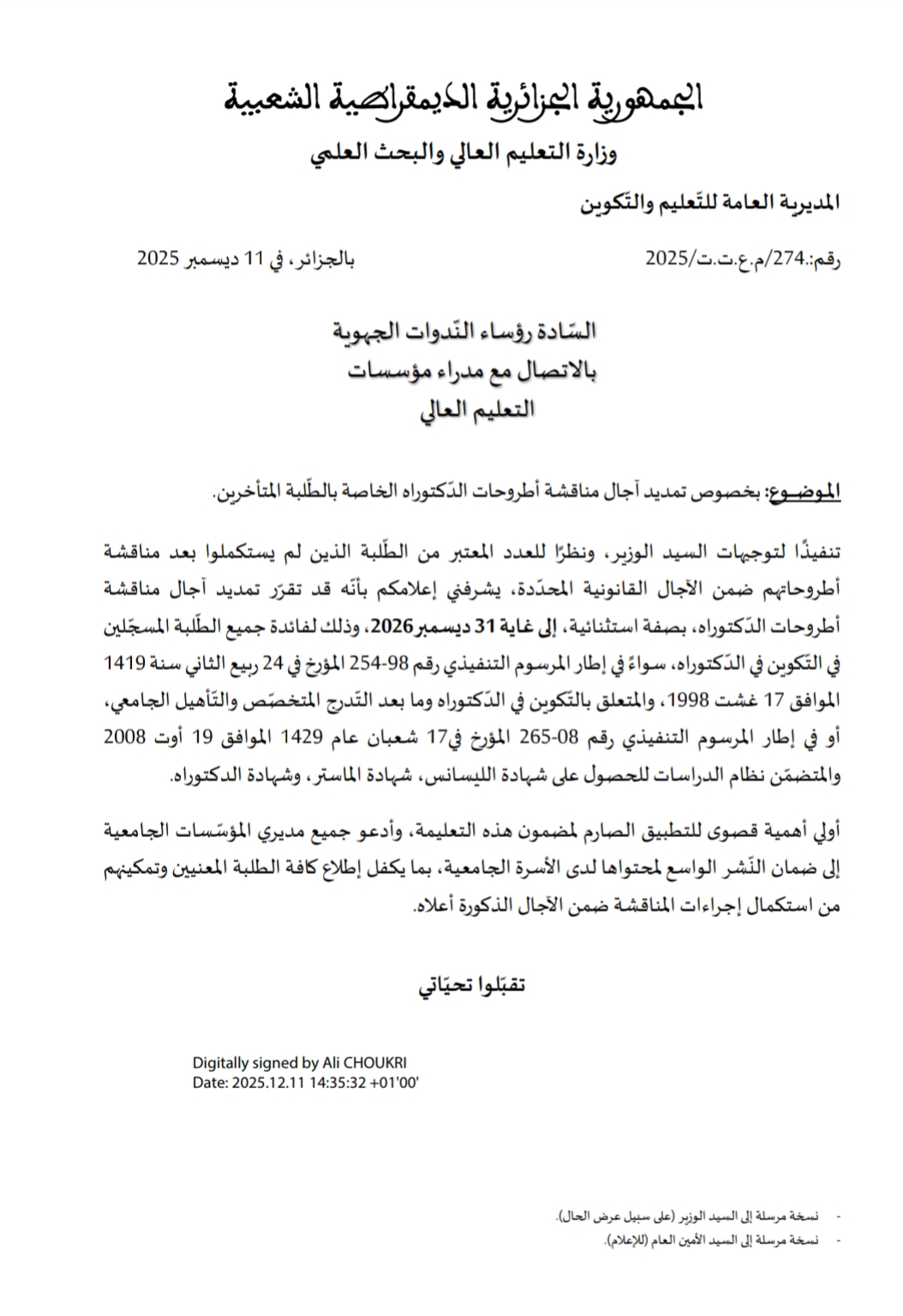 تعلن وزارة التعليم العالي والبحث العلمي عن تمديد آجال مناقشة أطروحات الدكتوراه للطلبة المتأخرين إلى غاية 31 ديسمبر 2026.