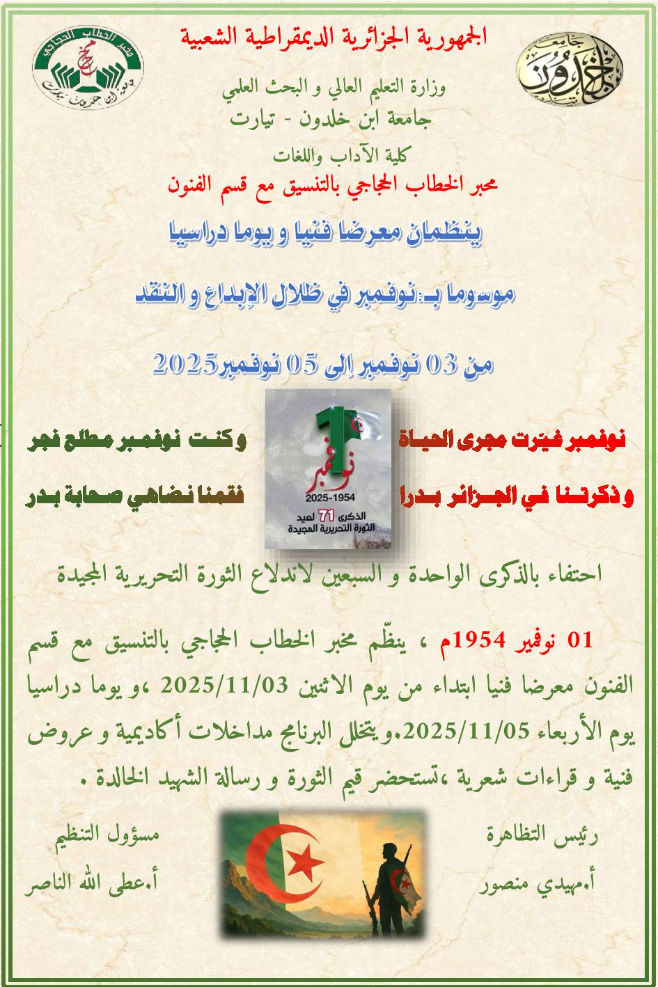 فعالية احتفالية بمناسبة الذكرى 71 لاندلاع الثورة التحريرية المجيدة، المنظمة من طرف مخبر الخطاب الحجاجي بالتنسيق مع قسم الفنون بكلية الآداب واللغات – جامعة ابن خلدون تيارت.