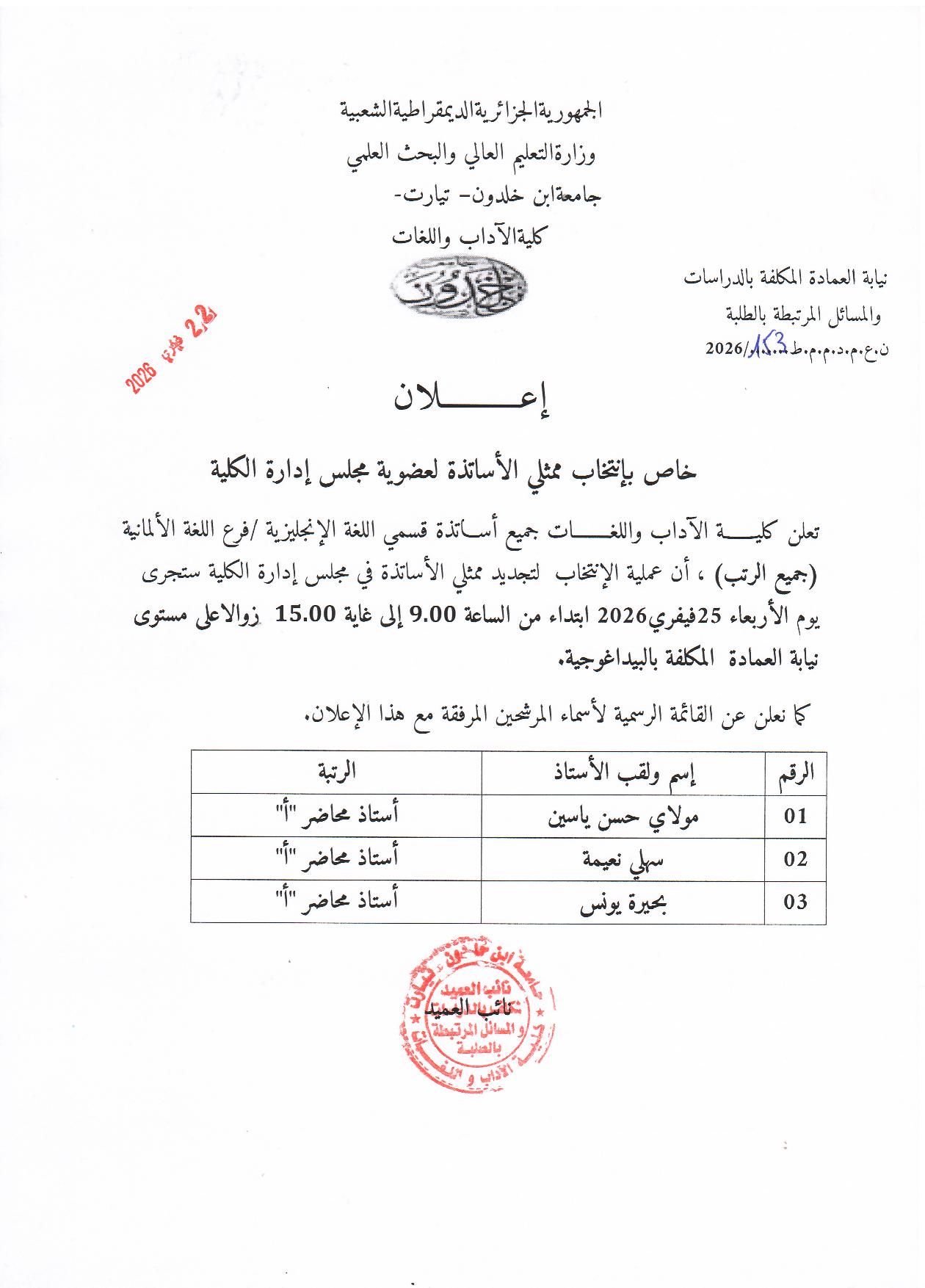 تعلن كلية الآداب واللغات لجميع أساتذة قسمي اللغة الإنجليزية وفرع اللغة الألمانية (جميع الرتب) أن عملية الانتخاب لتجديد ممثلي الأساتذة في مجلس إدارة الكلية ستجرى: