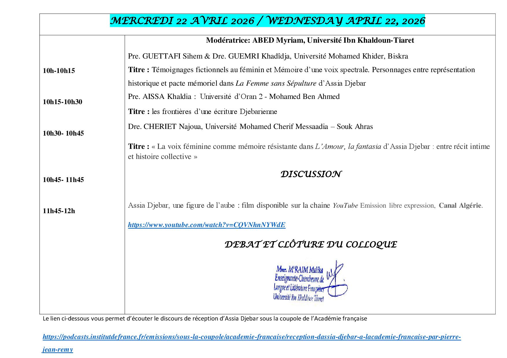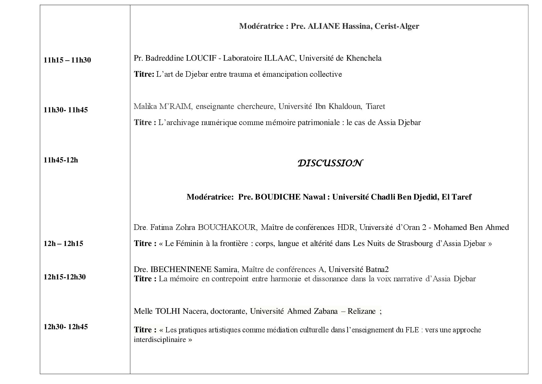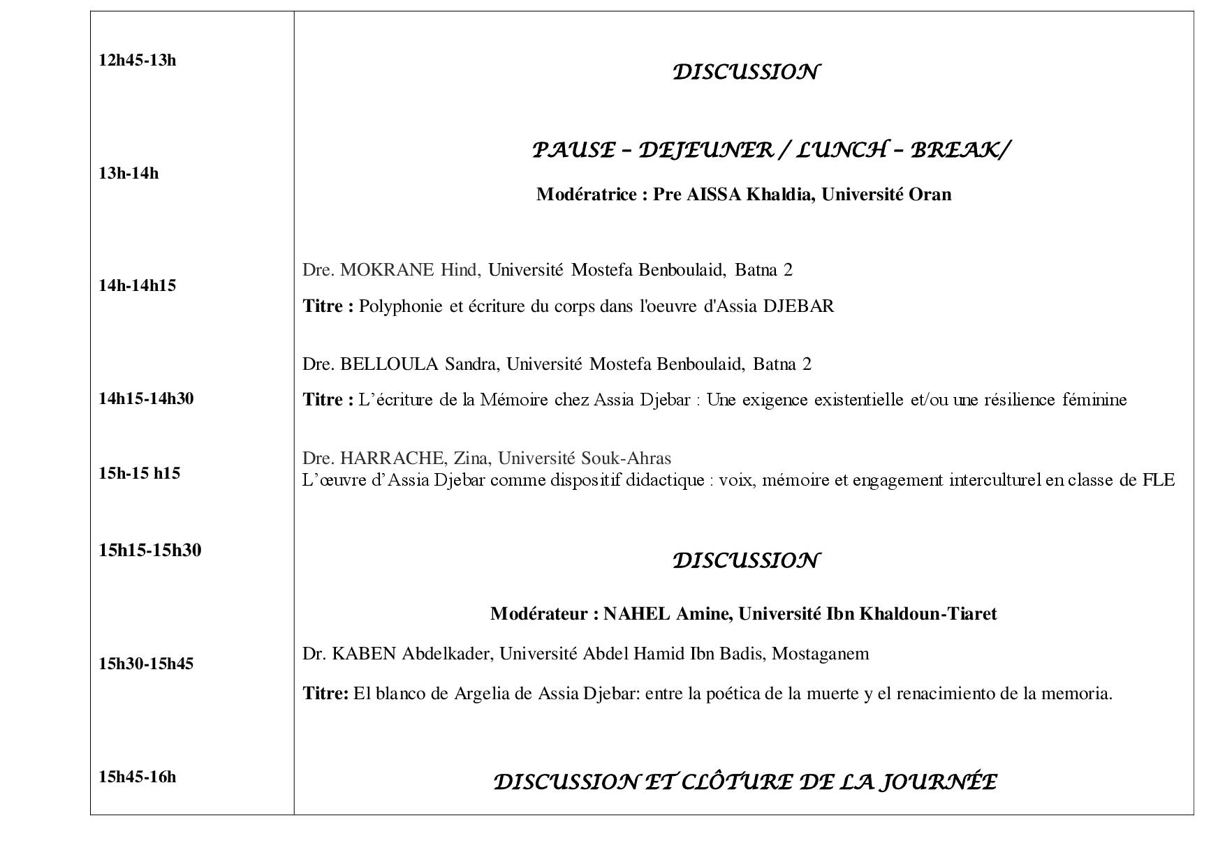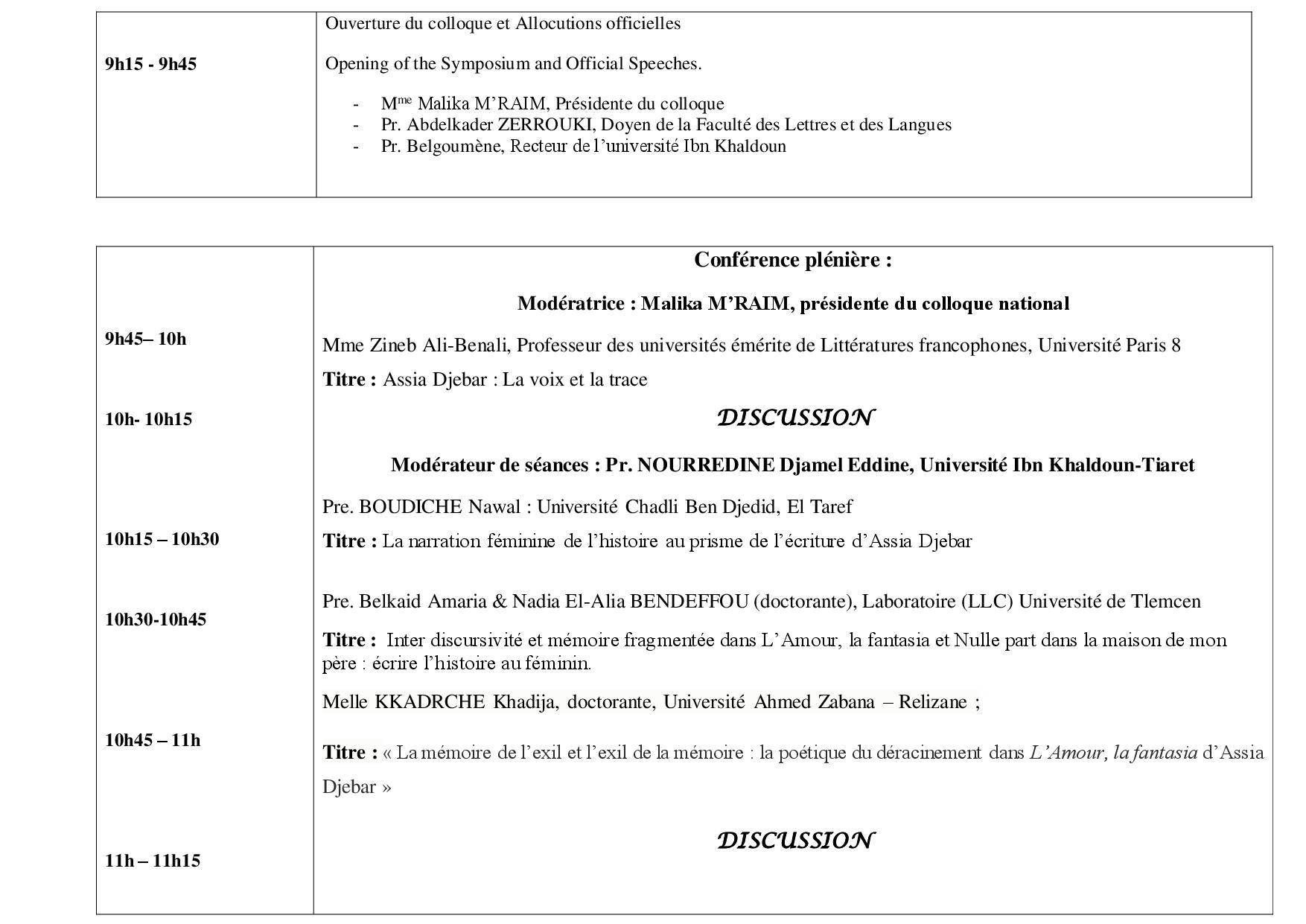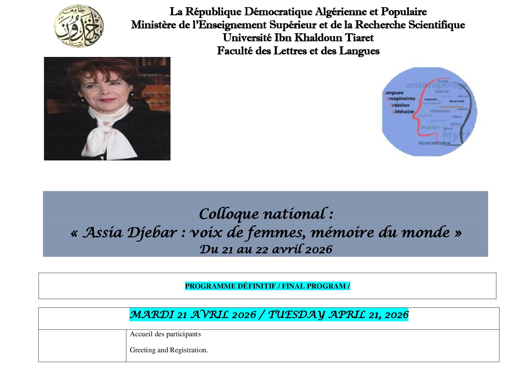 PROGRAMME Colloque national : Assia Djebar : voix de femmes, mémoire du monde 21/22 Avril 2026 تصفّح المقالات ملف التسجيل في الدكتوراه 2025/2026 Dossier d’inscription en doctorat 2025/2026